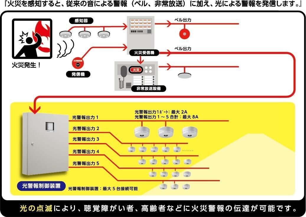 火災発生時、騒音などの音により警報音が認知しづらい工場や施設への設置も効果的です。